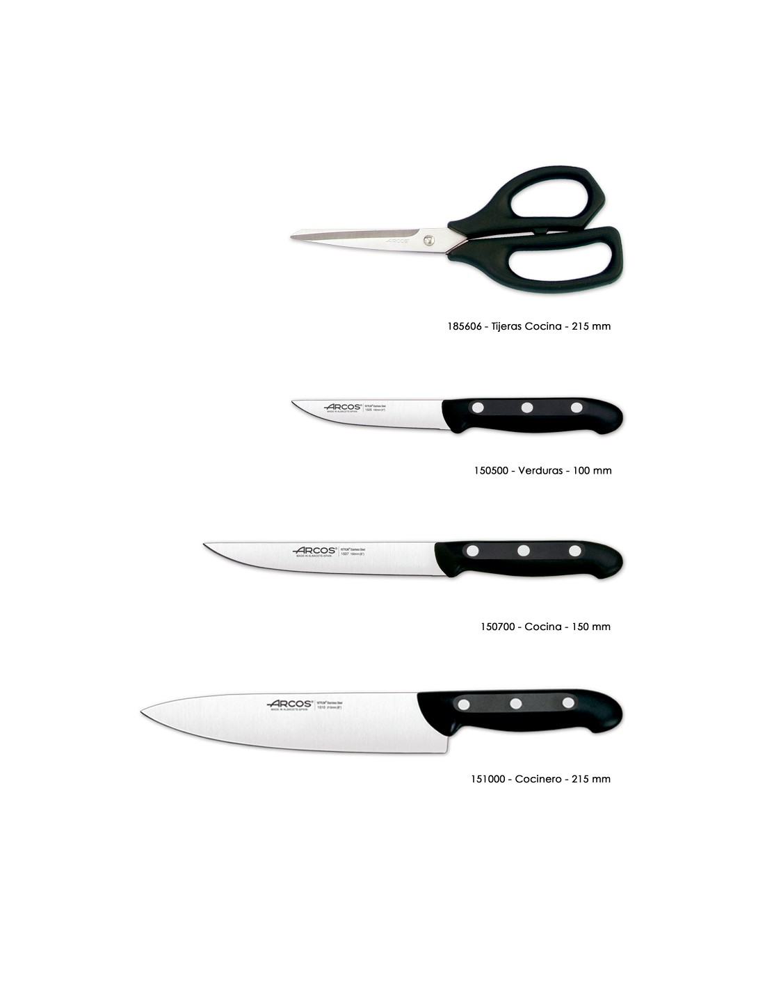 Este juego de cocina, compuesto por tres cuchillos, verduras 100 mm, cocina 150 mm, chef 210mm y unas tijeras, está fabricado por manos que saben en Albacete, España. En Arcos nos dedicamos al sector de la cuchillería desde 1734.